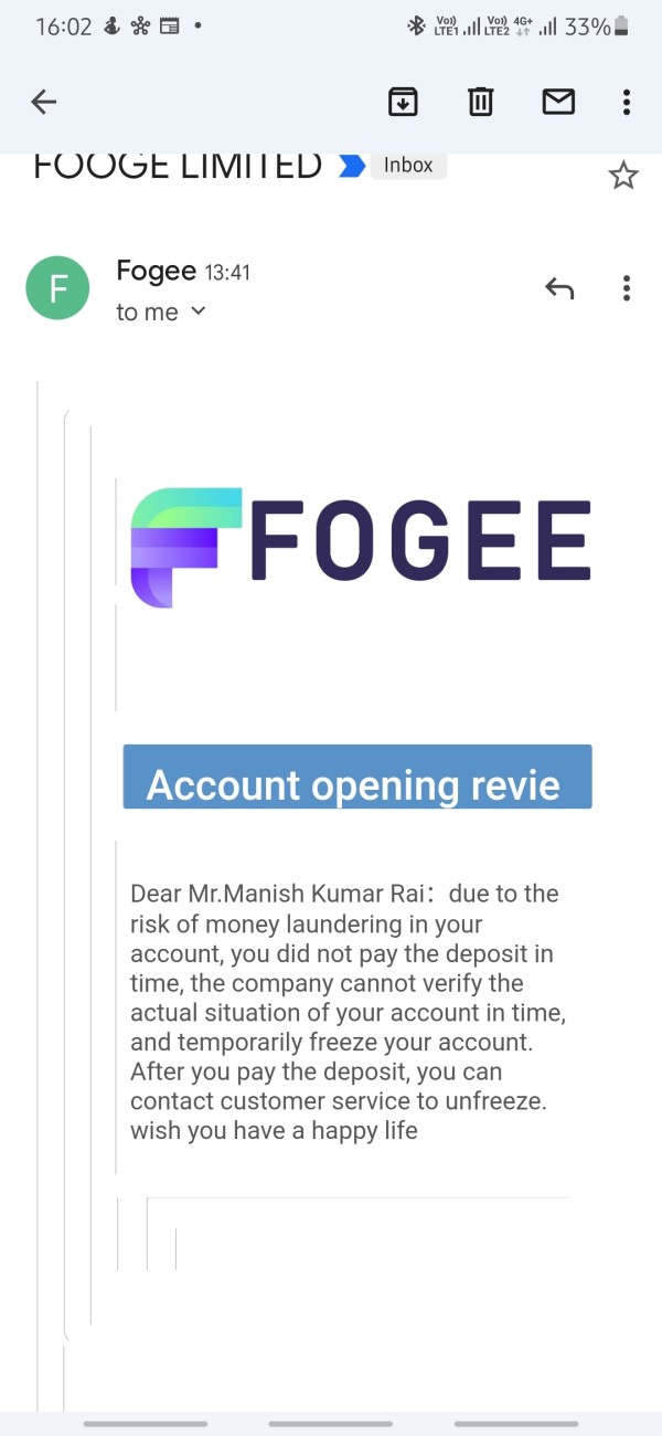 few days back I received unknown WhatsApp and being well wealthy she told me to help in commodity trading open account with fogee on mt5 and in few days make profit approx 37000usd when I request for withdraw some amount she given customer service manager no and that Manager ask me for tax 30% of total withdraw after some negotiation I change my plan and ask for withdraw only 200usd and paid 62 usdt as tax after some time he denied that fund not received and your account freeze