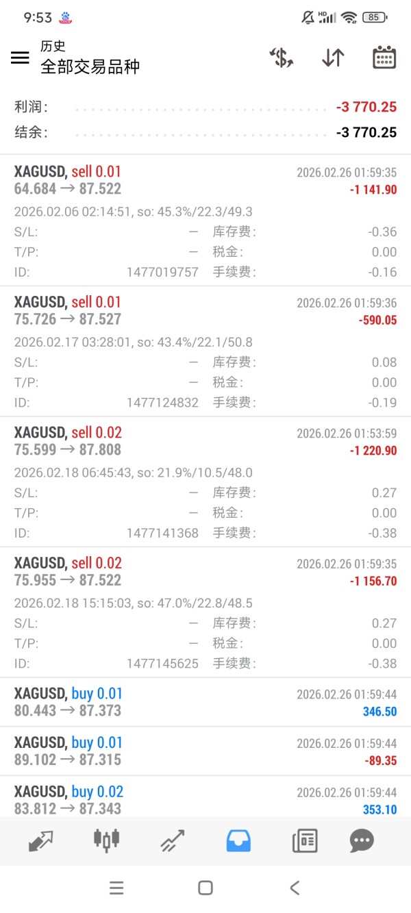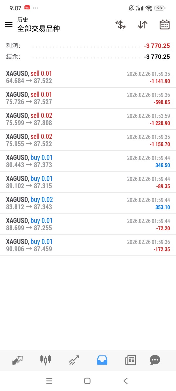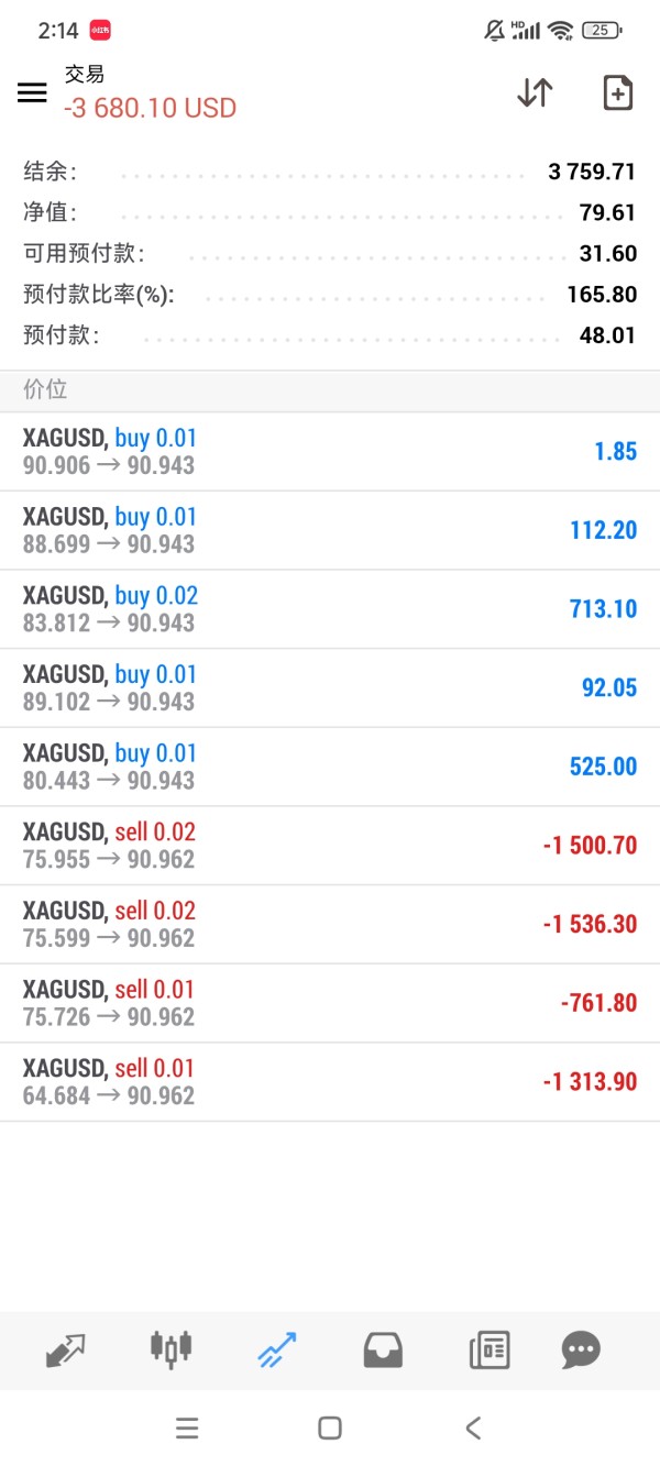 2月25号周三,账户内是0.06手白银多单,0.06手白银空单。锁仓了,当时周三净值是79.61,可用预付款是31.6美元,爆仓比例是50%,也就是还有54美元可操作。2月26号周四7;15分,账户未进行操作。净值是60美元,可用预付款是12.3美元,已经扣除了三倍隔夜费。按照爆仓50%比例,我还有36美元可操作。期间我没有任何操作,等到9点我想要接着入金,发现账户被强平了,直接爆仓。 也就是富拓平台,在我账户还有 36美元可操作资金的情况下,强行给我爆仓了,之前也遇到过几次这种情况,这次忍无可忍。
