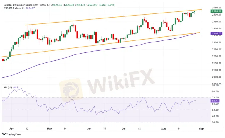 Giá vàng giao dịch trong vùng tích cực trong ngày. Kim loại quý vẫn mắc kẹt dưới ranh giới trên của kênh tăng giá kéo dài năm tháng và mức cao nhất mọi thời đại. Tuy nhiên, bức tranh tổng thể vẫn là xu hướng tăng giá, với giá vẫn cao hơn đáng kể so với đường trung bình động hàm mũ 100 ngày (EMA) trên khung thời gian hàng ngày. Động lực tăng giá được xác nhận bởi chỉ số sức mạnh tương đối 14 ngày (RSI) nằm trên đường trung bình gần 61,00, cho thấy vẫn còn tiềm năng cho xu hướng tăng thêm.