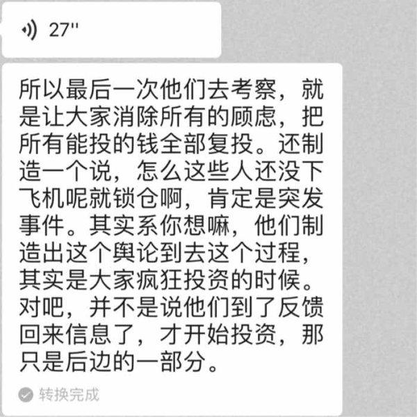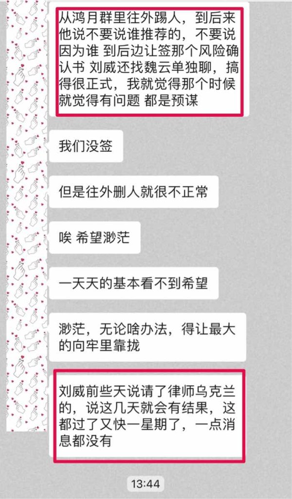 目前乌克兰公司彻底失联,平台不能出金已经半年时间,作为中国区对接人的崔景景和潘凯辰,在此期间以疫情和请律师尽调公司为由拖延时间维稳,甚至派心腹分子低价收取会员帐户美元,使会员误以为出金指日可待。直至被会员直接派人去乌克兰实地查泟,所谓公司是仅为人民币三百元的注册资金,已经搬离办公地,套用美国IBMCC公司NFA牌照(已被撤销)。崔景景和潘凯辰仍然谎称请律师在调查中,崔景景甚至挪用五万元经费为自己洗白请律师告乌克兰公