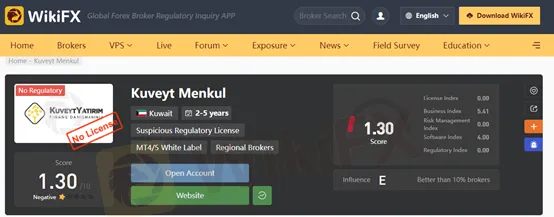 在监管方面,已经证实 Kuveyt Menkul不受任何有效法规的约束。这就是为什么它在 wikifx 上的监管状态被列为“无牌照”,并且它的评分相对较低,为 1.30/10。请注意风险。