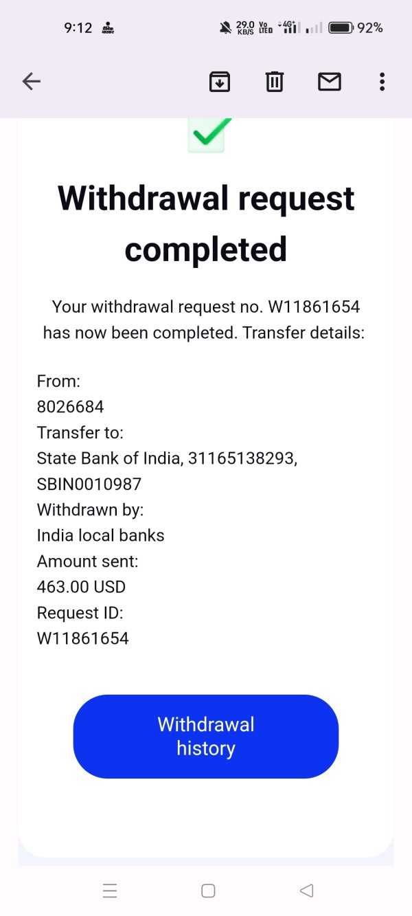 my withdrawal note received in my bank account
