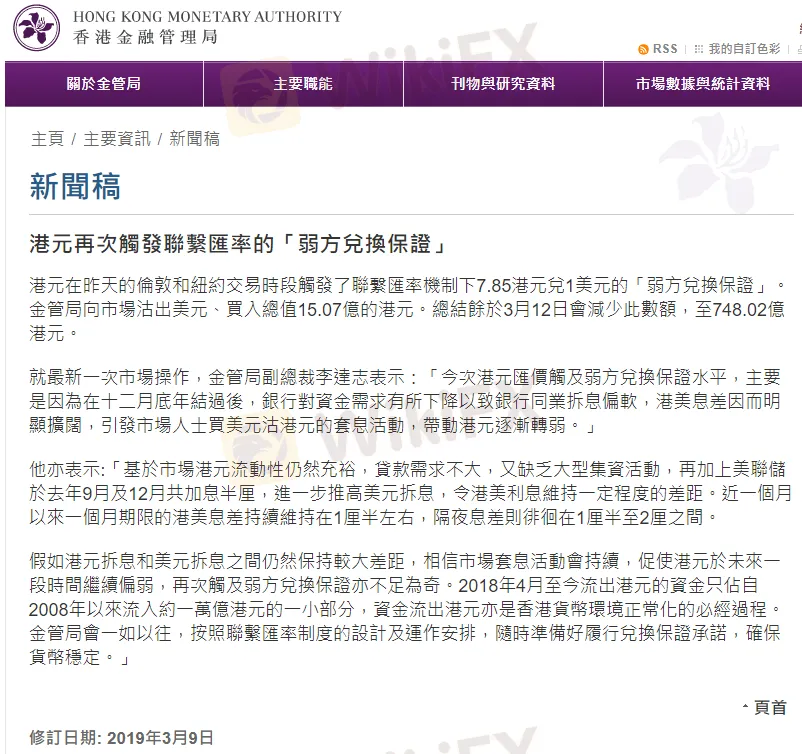 因港元兑美元再一次触及7.85的弱方兑换保证,香港金管局在美东时间3月11日周一美股收盘前一小时买入了15.1亿港元。虽然此事香港官方没有回应,但是早在3月8号,香港金融管理局官网就公布了出手干预汇率的新闻稿,为此买入了15.07亿港元。