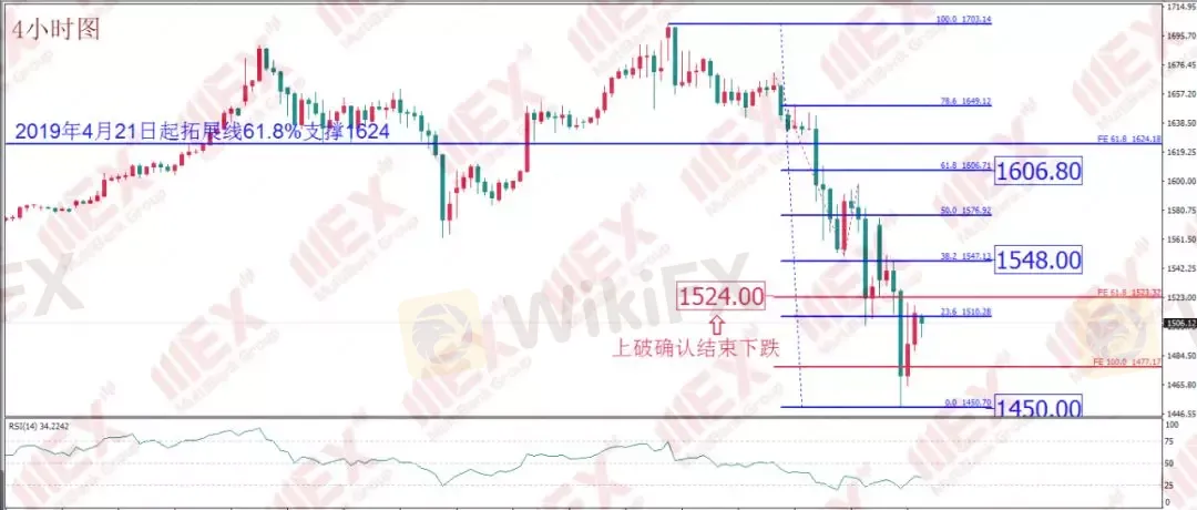 技术上4小时级别于上周五形成5浪下跌(5浪昨日出现延伸浪),昨日价格于拓展线100%位置探底拉升,接下来需用1524的上破来确认下跌的结束,若是如此行情仍将开启ABC反弹走势,A段反弹压制点或在分割线38.2%附近。