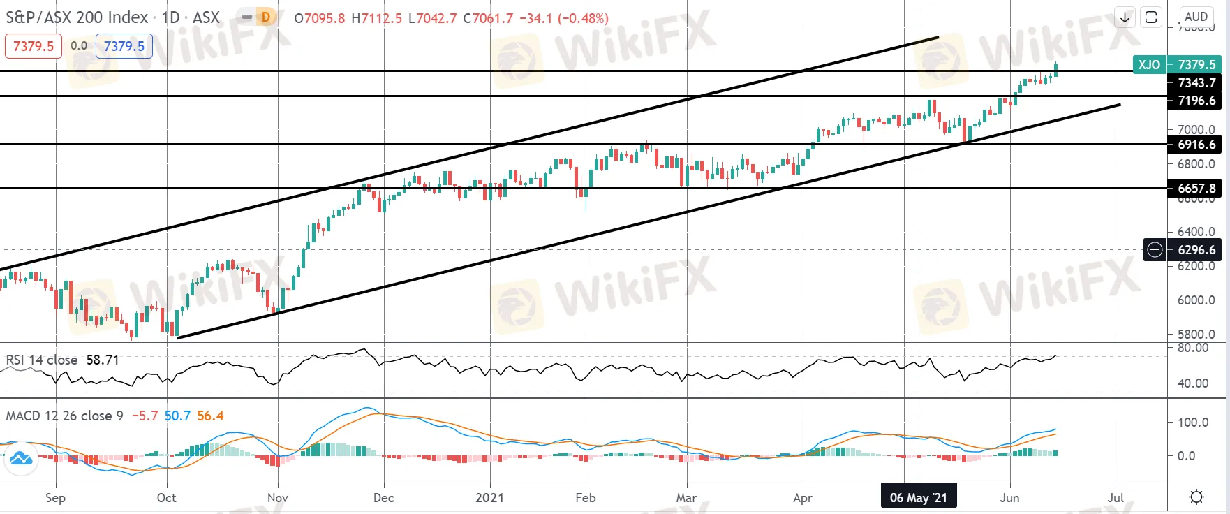 随着牛市通道的进一步发展,ASX 的反弹使该指数突破了 7343.7 的水平。不过 RSI 和 MACD 都看涨,RSI 处于超买区域,MACD 显示看跌背离,警惕任何反转走低。如果价格回到 7343.7 水平以下,7196.6 和上升通道低点是下一个值得关注的支撑区域。