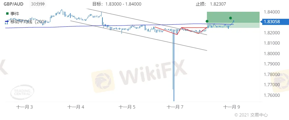 2021年 11月 08日(GMT时间12:30)我们在30分钟图表上发现称为双重底的形态,确定了长达2周在1.83000到1.84000范围内的目标价。