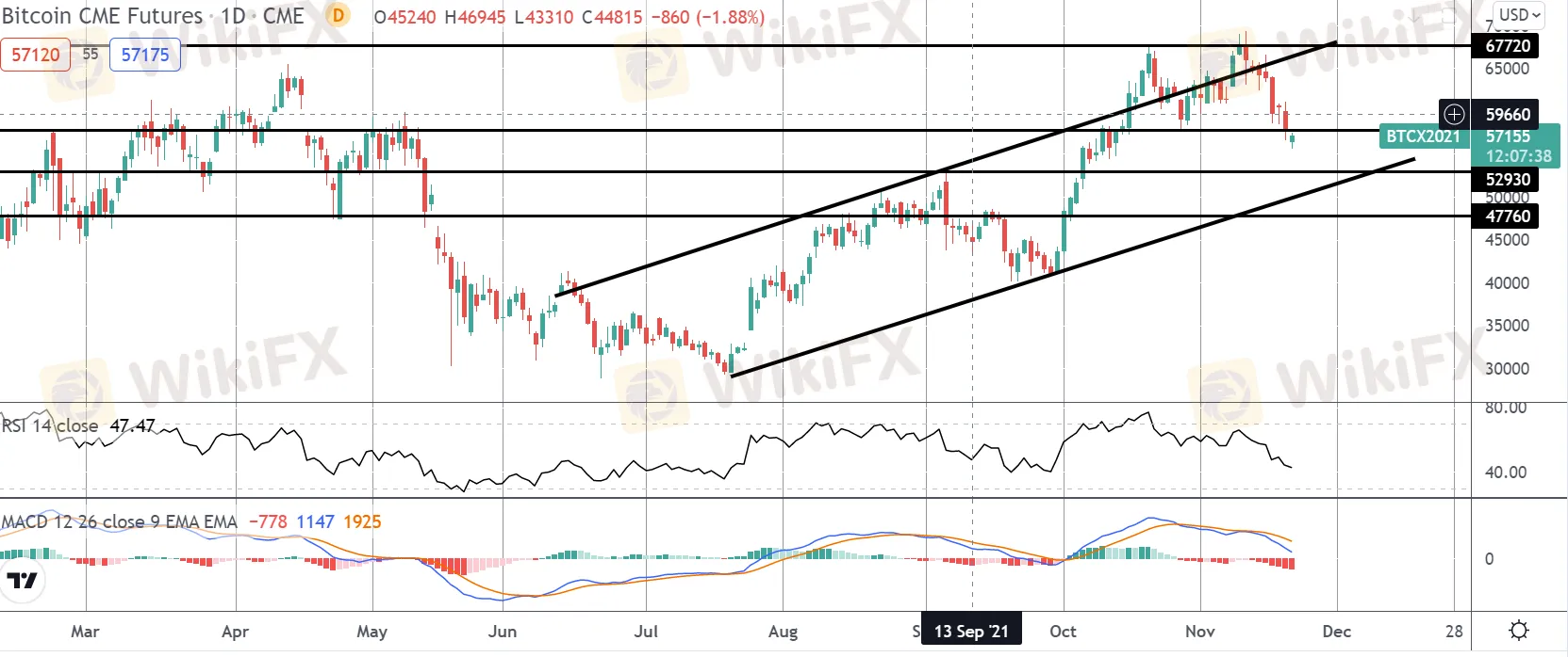 最近反弹至67720点,伴随着动量研究中大量的熊市分歧,随后的反转导致价格交易回到牛市通道。Price现在正在测试57805级别的支持。此处下方的中断将使52930成为焦点,同时上升通道低点。然而,如果多头能在这里保持支撑,焦点将继续放在进一步上涨上。