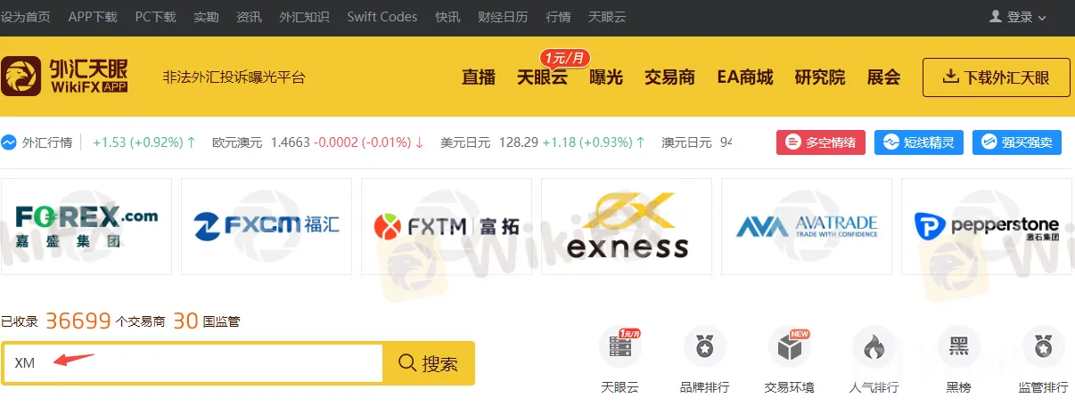 选择一家好的外汇交易平台,首当其冲肯定是需要选择安全可靠的平台,对无监管的平台说不。那么XM的监管转态如何呢?在外汇天眼首页的搜索查询栏输入“XM”即可跳转至交易商详情页。