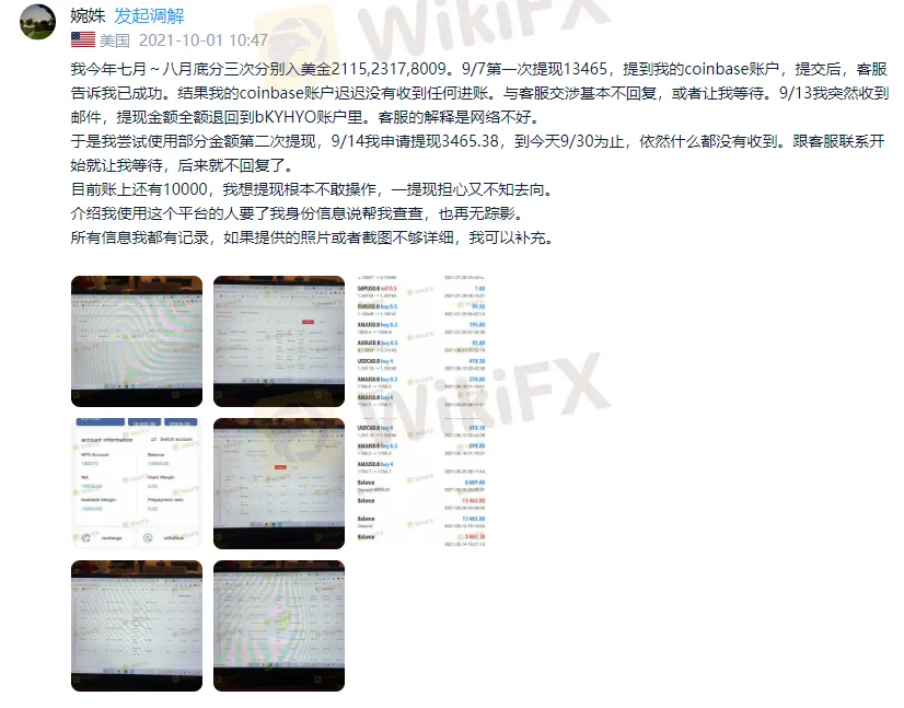 【我今年七月~八月底分三次分别入美金2115,2317,8009。9/7第一次提现13465,提到我的coinbase账户,提交后,客服告诉我已成功。结果我的coinbase账户迟迟没有收到任何进账。与客服交涉基本不回复,或者让我等待。9/13我突然收到邮件,提现金额全额退回到bKYHYO账户里。客服的解释是网络不好。
