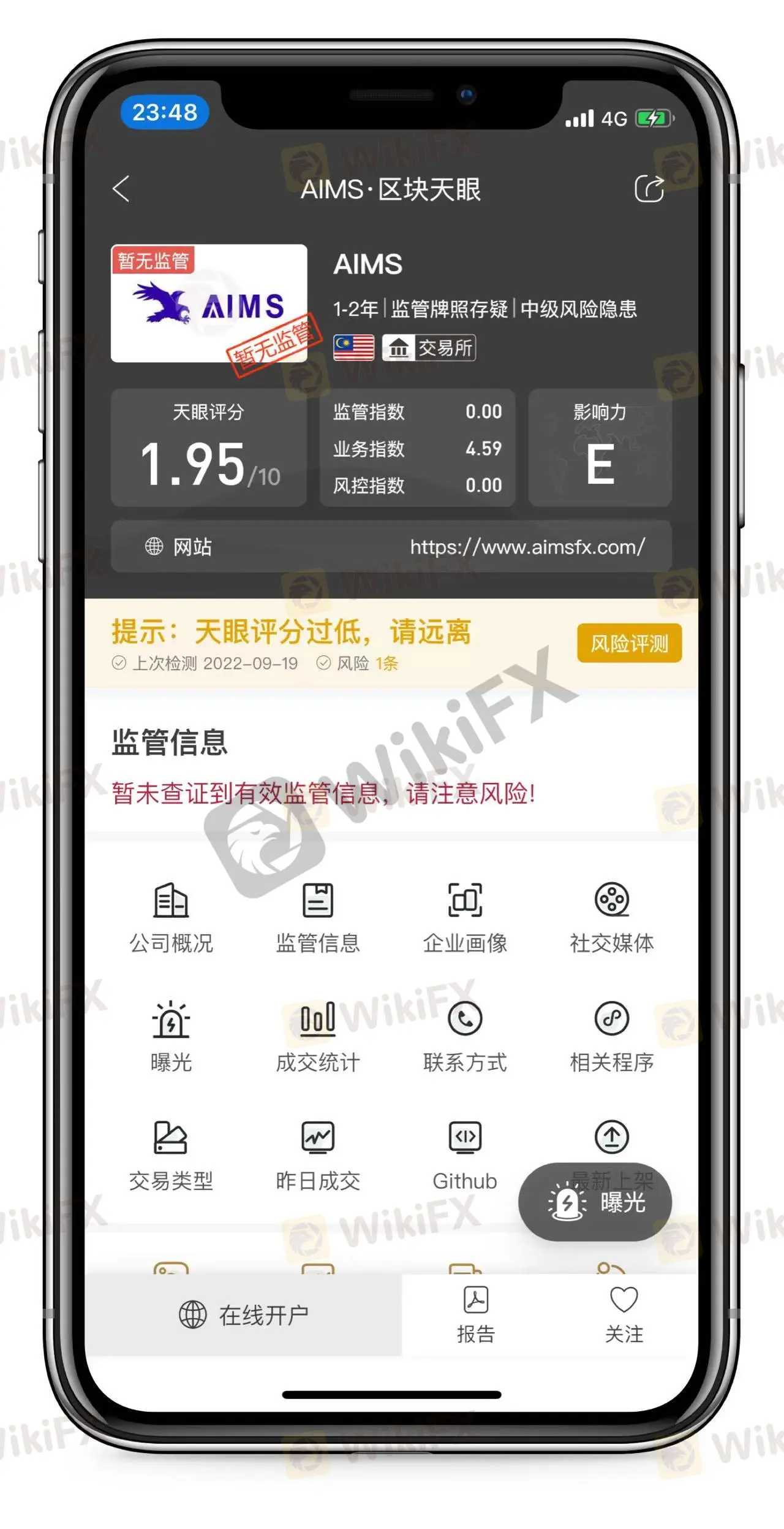其实有很多方法可以避免出现这样的情况,在做外汇和其他交易之前,可以在我们外汇天眼上面先检索一下该平台是否可靠,就拿AIMS平台举例,在天眼首页搜索AIMS可以得出如下结果: