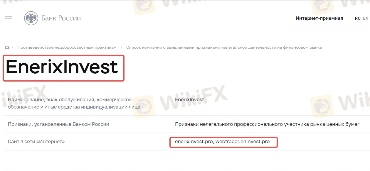俄罗斯联邦央行已将Enerixinvest列入在金融市场上发现有非法活动迹象的公司名单。
