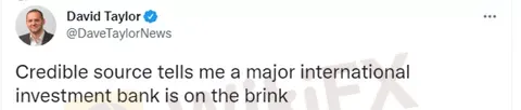 澳洲广播公司( ABC )旗下商业记者 David Taylor 根据“可靠消息”,在推特表示一间大型投资银行濒临破产。消息散播后引来热烈讨论,国外市场疯传百年银行巨头瑞士信贷( Credit Suisse )爆雷。