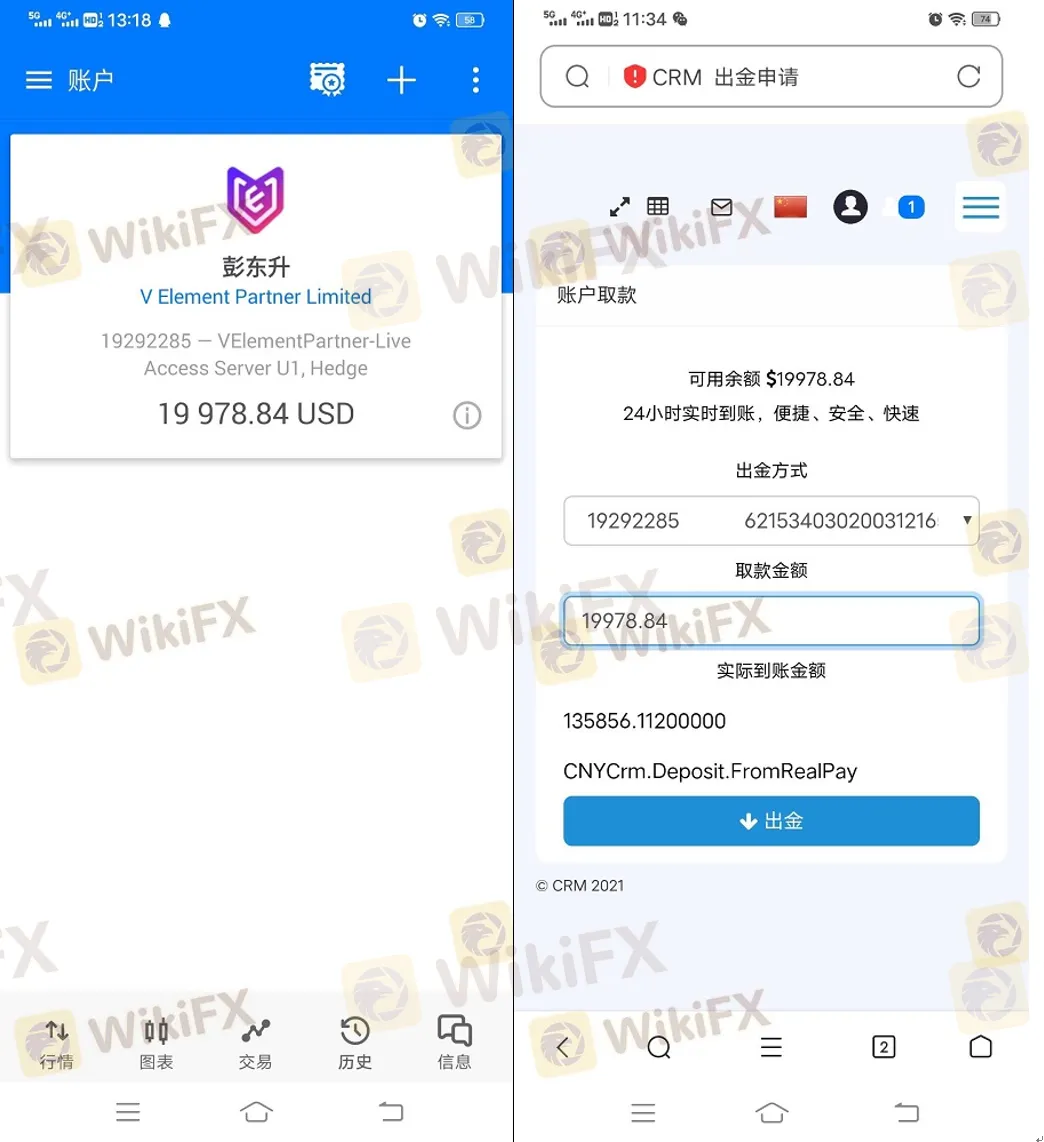 日前,又有投资者向外汇天眼反映“V Element Partner”存在无法出金问题。