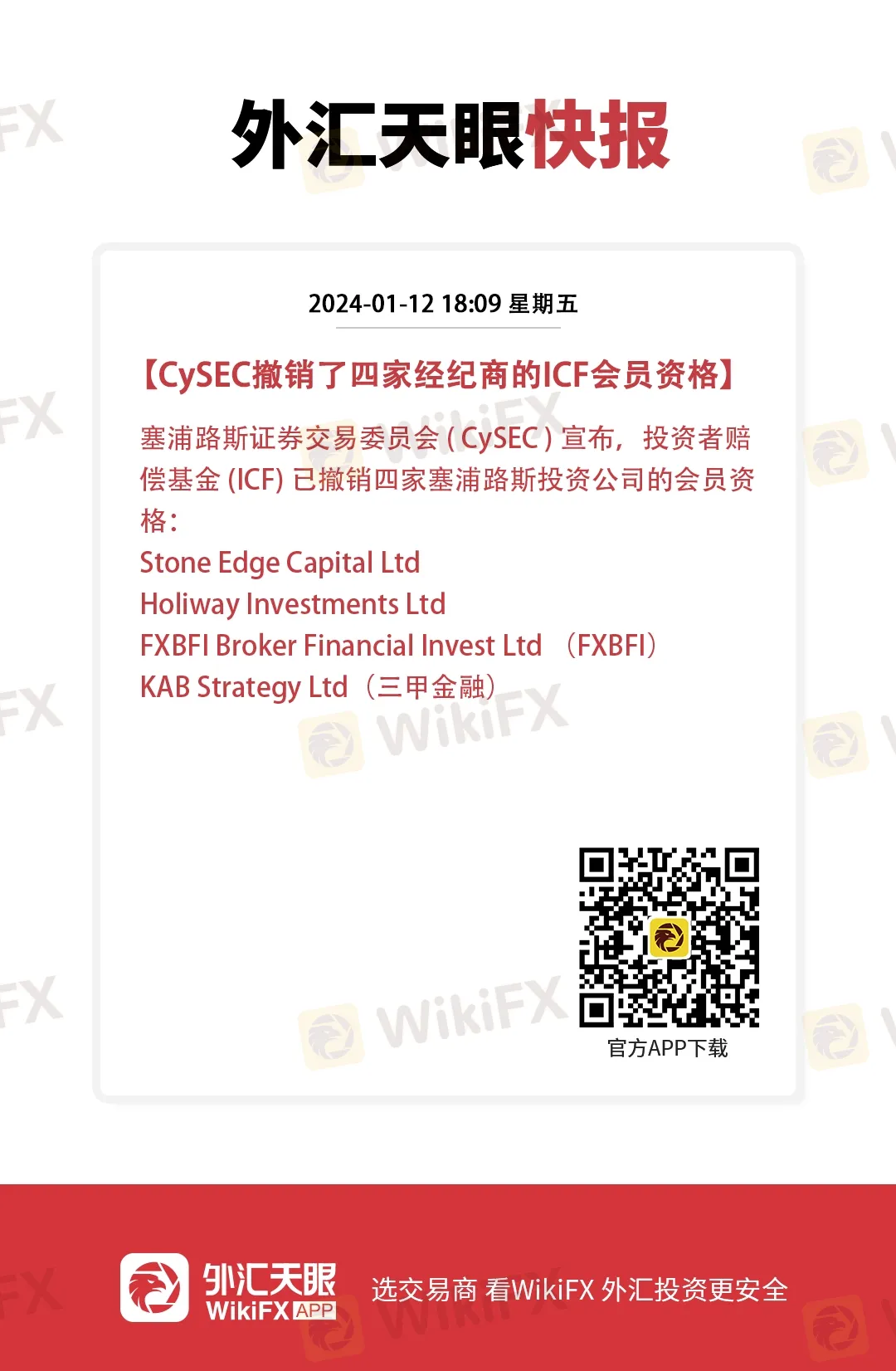 摘要:塞浦路斯证券交易委员会 (CySEC ) 宣布,投资者赔偿基金 (ICF) 已撤销四家塞浦路斯投资公司的会员资格: Stone Edge Capital Ltd Holiway Investments Ltd FXBFI Broker Financial Invest Ltd (FXBFI) KAB Strategy Ltd(三甲金融)