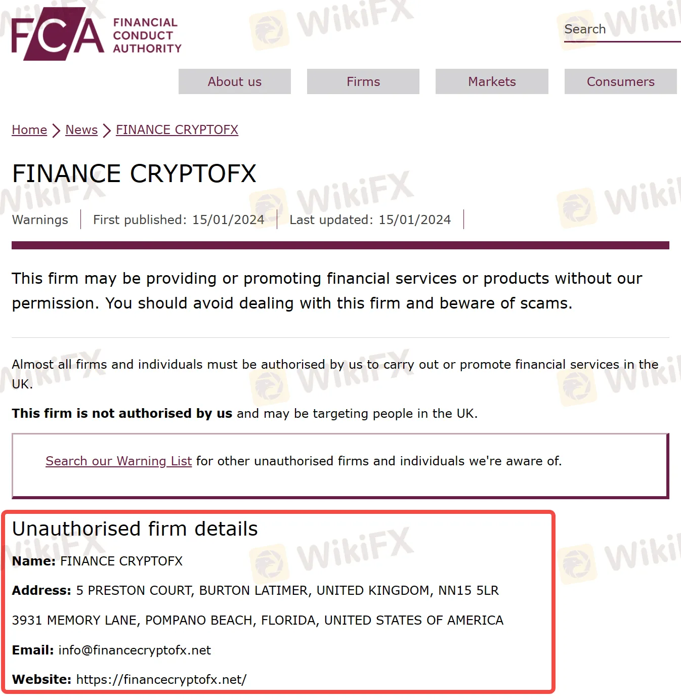FCA认为FINANCE CRYPTOFX存在欺诈投资者、非法集资等严重违法行为的可能。并警告投资者不要与该公司进行任何交易或投资,如果一旦遭受资金损失,将无法使用金融申诉专员服务或受到金融服务补偿计划 (FSCS) 的保护。