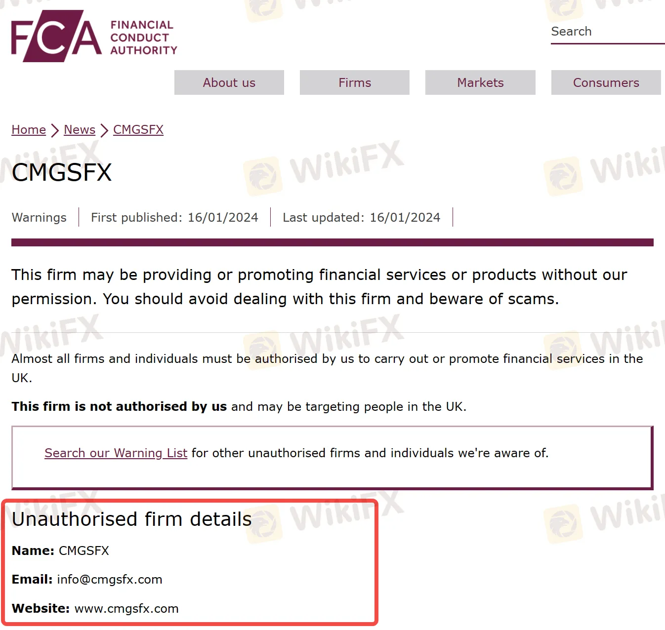 1月16日,英国金融行为监管局(FCA)发布了一则投资者警示公告,公告内容称一家名为CMGSFX的公司可能在未获FCA授权的情况下,向投资者非法提供金融服务或产品。