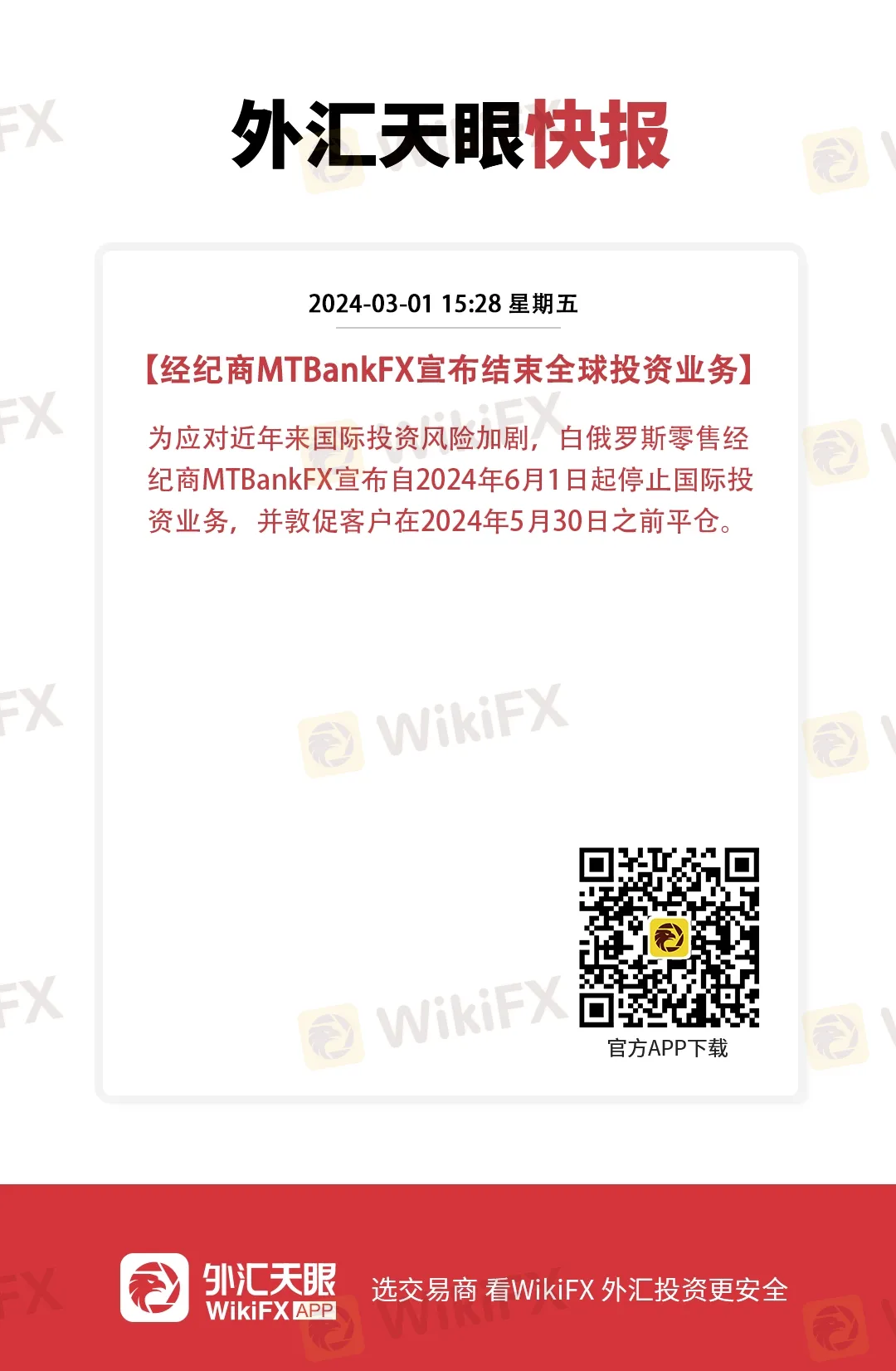摘要:为应对近年来国际投资风险加剧,白俄罗斯零售经纪商 MTBankFX 宣布自 2024 年 6 月 1 日起停止国际投资业务,并敦促客户在 2024 年 5 月 30 日之前平仓。