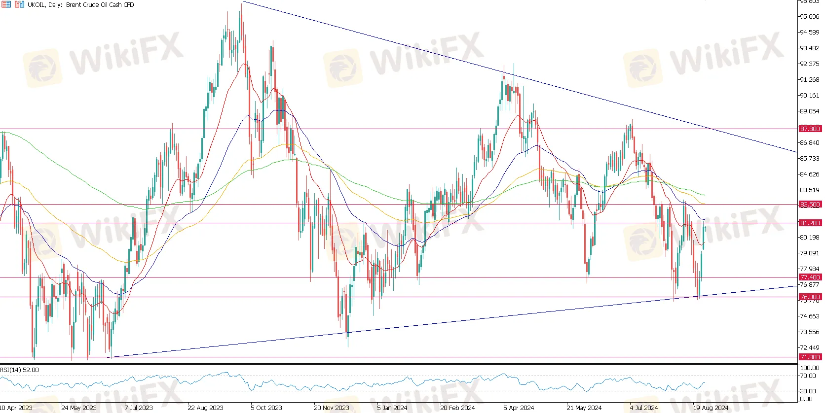 在布伦特原油(UKOIL)方面,过去三个交易日出现连涨,但从过去一个月的走势可见布伦特原油价格区间仍处于82.50 – 76.00 美元的区间。