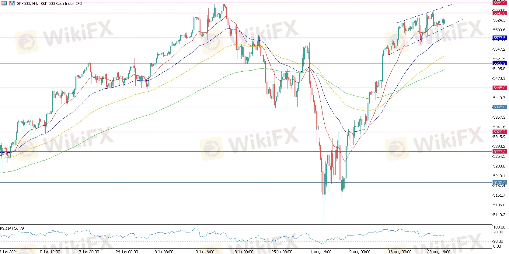 在4小时图上,盘整区间明显位于5643至5577之间,并且有可能形成上升楔形,暗示短期内可能出现看跌反转。然而,只有当价格有效跌破该上升楔形时,才可以确认这一反转信号。因此,在短期内交易者可关注任何突破的可能。