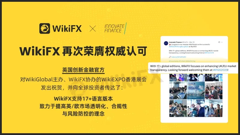 近日,英国创新金融协会(Innovate Finance)在官方社交媒体热烈祝贺由WikiGlobal主办、WikiFX协办的WikiEXPO香港展会取得圆满成功,并强调:WikiFX作为全球领先的外汇交易信息平台,为180+国家与地区的用户提供17种语言版本的服务,致力于提升英国及欧洲金融市场的透明化、合规性与风险防控,助力投资者识别安全可靠的外汇交易环境。