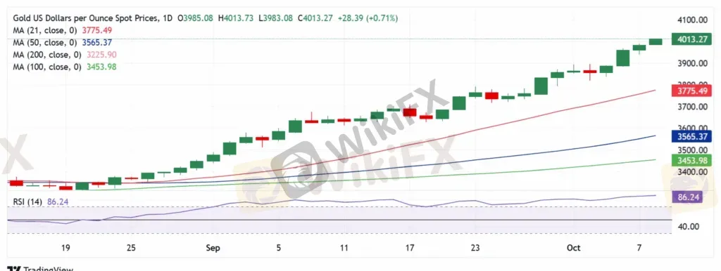 周三早些时候,黄金在历史上首次突破 $4,000 这一关键关口,创纪录的爆炸性上涨势头仍未中断。