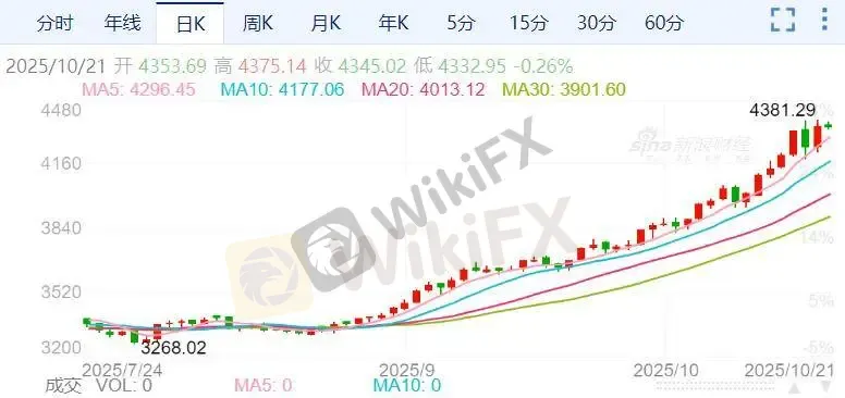 周一(10月20日),现货黄金价格强势上涨逾2.5%,不仅收复了上周五的全部跌势,还一度刷新历史高点至每盎司4381.29美元,最终收报4356.26美元,涨幅约2.5%。周二(10月21日)亚市早盘,现货黄金高位震荡,目前交投于4368.89美元/盎司附近。