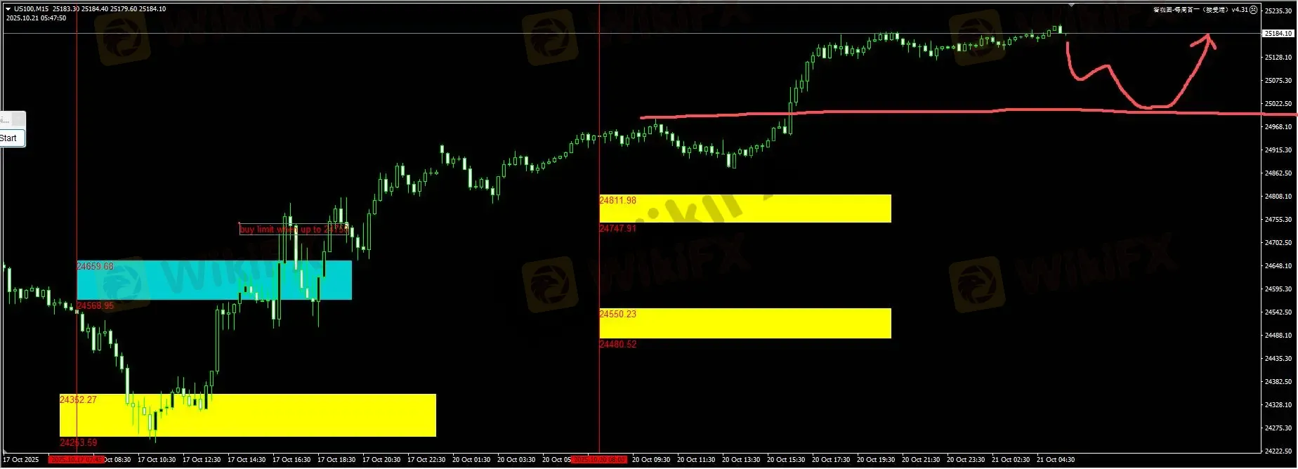 纳指:昨天我们插件希望出现的回扫黄色区域之后再做多的走势没有出现。日内密切关注25000关口附近的回踩表现,我们今天会在该水平附近设置绿色+黄色的操作组合。详细位置请咨询插件。