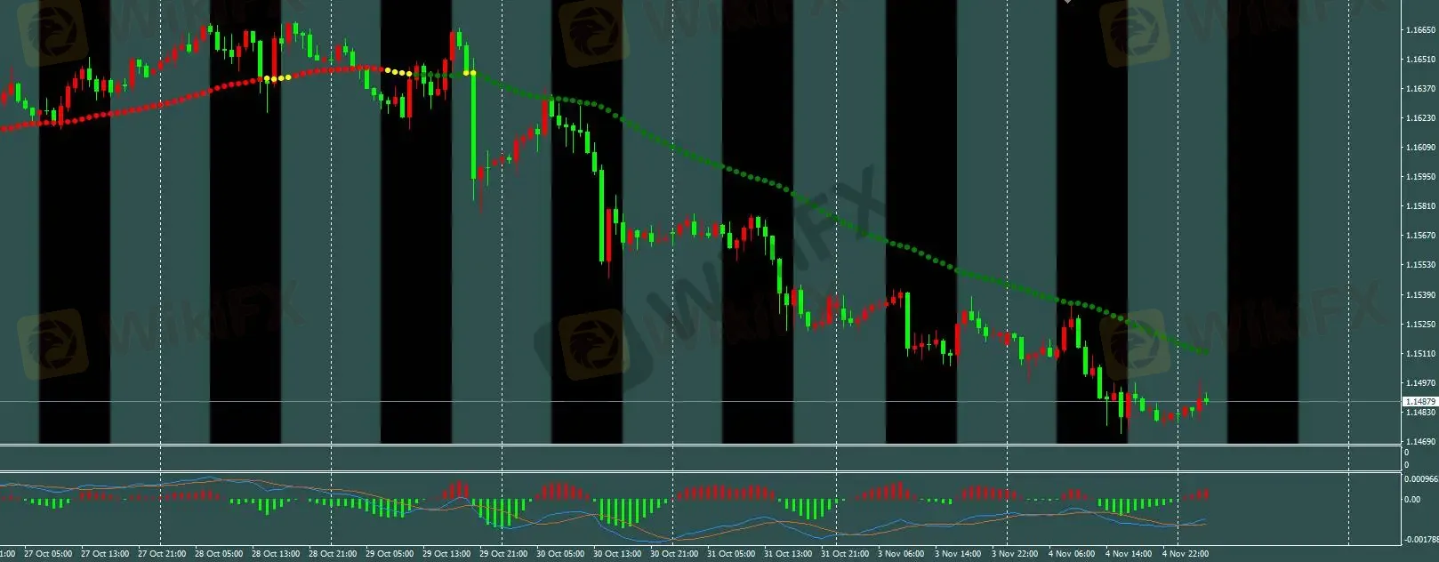 三色线策略:H1趋势线维持绿色,H1空单1.1643已盈利,日内参考M5模型短线交易。