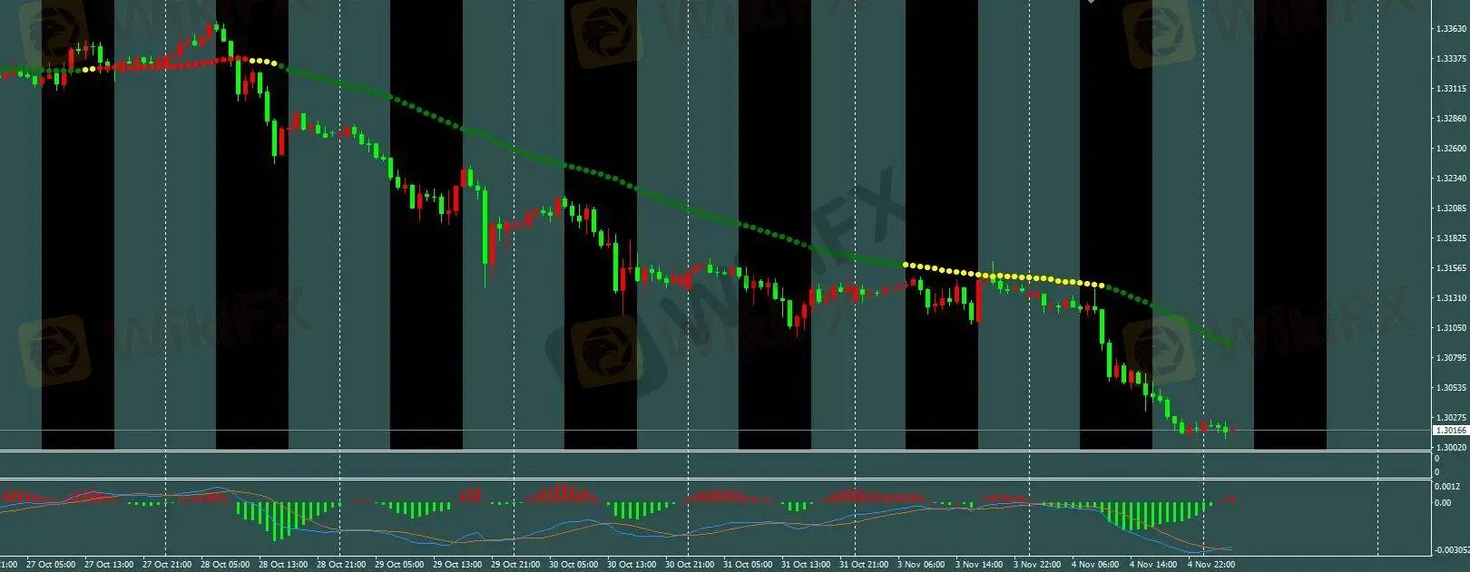 三色线策略:H1趋势线转绿,空单过滤未开仓,日内参考M5模型操作。