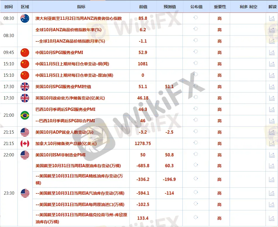 周二,因美联储内部分歧引发了对今年再次降息前景的怀疑,美元指数延续涨势,并上破100大关,创三个月来的新高,最终收涨0.33%,报100.18。基准的10年期美债收益率最终收报4.090%,对美联储政策利率敏感的2年期美债收益率收报3.586%。 周二(11月4日)现货黄金震荡下跌1.7%,收报3931.78美元/盎司,美联储官员内部分歧加大,市场对美联储12月降息预期降温,帮助美元指数升破100关口,刷新逾三个月高点,对金价打压明显。不过,美国股市泡沫隐忧与美国政府史上最长停摆仍给金价提供避险支撑。短期内,黄金空头略占上风,金价短线面临进一步回调风险,但若周三ADP民间就业数据爆冷,金价或迎来戏剧性反转。