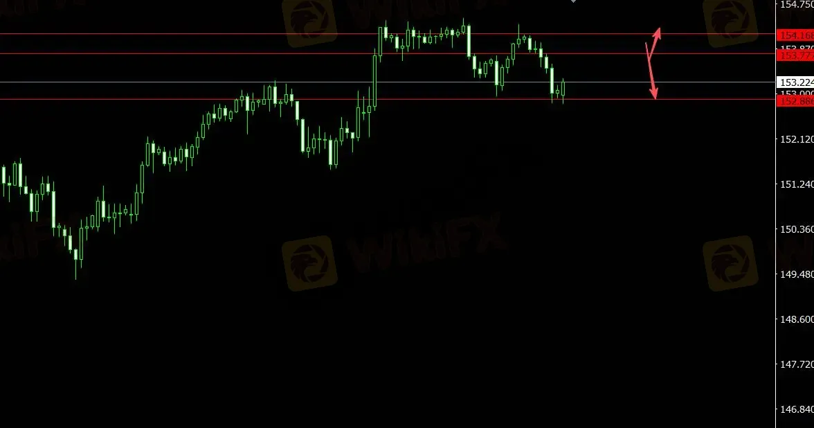 美元指数受支撑,日元反弹,关注支撑位152.890,4小时看多至154.170;关注压力位153.780,4小时看空至152.560。