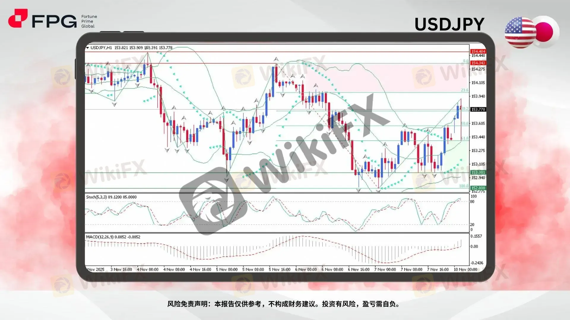 摘要:美元兑日元(USDJPY)交投于 153.77 附近,从上周低点 152.80 附近反弹,因美元在美国收益率走强的带动下重获动能。该货币对突破 50% 斐波那契回调水平后,延续了日内反弹势头,显示出新的看涨动能。然而,上方 154.34–154.48 区间的阻力仍然限制了升势,使短线交易者对区间结构内的潜在回调保持谨慎。从结构上看,美元兑日元依然在修正区间内震荡,但随着价格接近布林带上轨,动能逐步