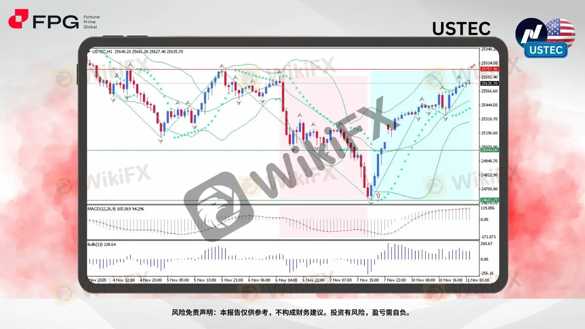 摘要:USTEC(纳斯达克指数)在测试关键支撑位 24,601 后强势反弹,标志着其短期走势出现决定性转折。此前,该指数自 25,692 区域经历深度回调,如今形成一个完整的 V 型反弹,价格重新回到 25,635 附近震荡。这一反弹确认了低位买盘的强劲兴趣,显示市场参与者正积极捍卫支撑区,并可能正为再次冲击上方阻力区域 25,757 做准备。从技术面来看,多项指标显示出动能回升的积极信号。布林带开始扩
