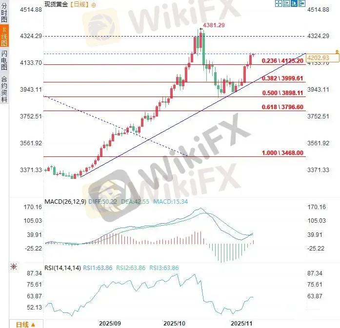 周四(11 月 13 日),现货黄金连续第五个交易日上涨,目前累计涨幅约 5.5 %,金价站上每盎司 4200 美元。近期买盘压力持续坚挺,主要受美联储可能实施更宽松货币政策的预期支撑,该预期导致美元走弱并提振黄金需求。若这一政策前景持续,未来几个交易日看涨动能或将进一步增强。
