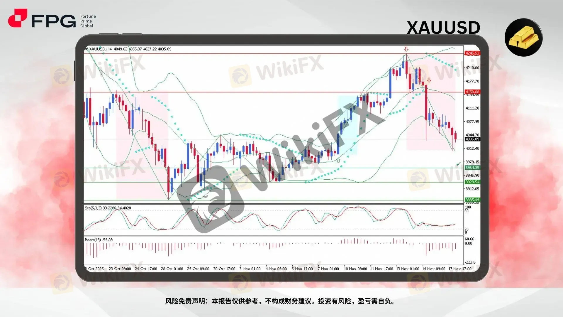 随机指标(Stochastic Oscillator 5,3,3)目前徘徊在 33/34 附近,位于低位区域,但尚未进入极度超卖区域——为价格继续走弱留下空间。Bears Power 已深度进入负区,为 -59.09,确认卖方主导当前周期。3964–3929 区间现为关键反应区,历史反弹曾多次在此形成支撑。