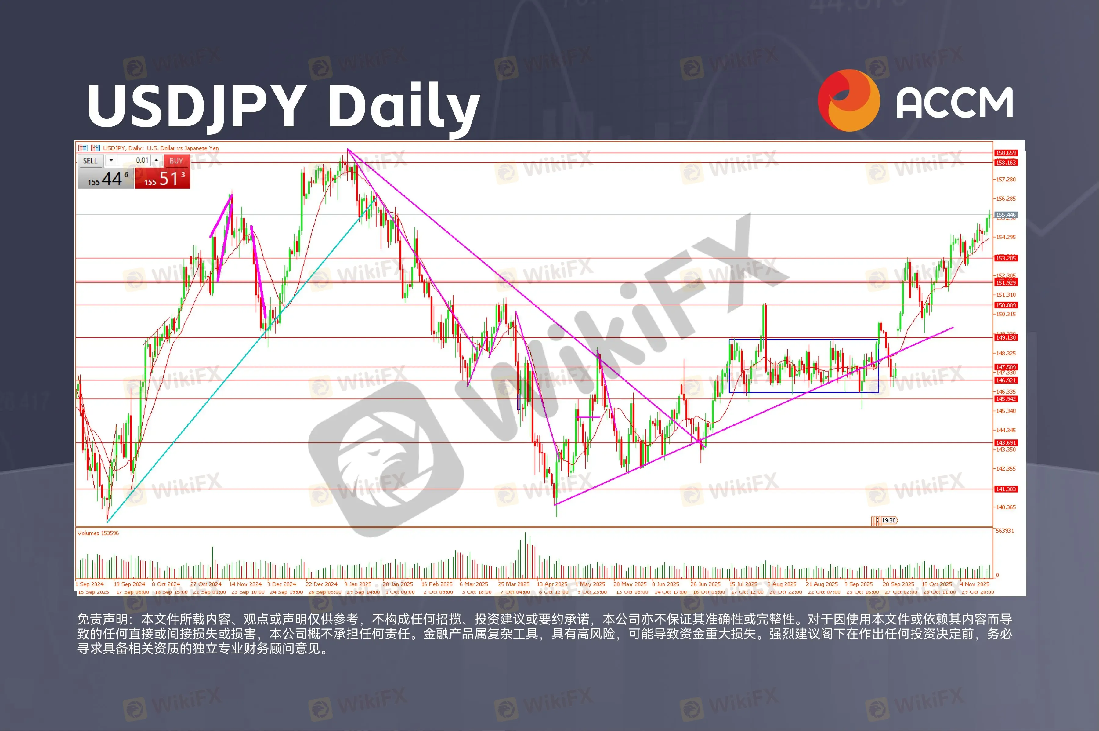 与此同时,美元兑日元(USDJPY)在下方上升趋势线上获得支撑,目前正测试上方上升趋势线,形态上呈上升楔形。MACD出现明显背离迹象,一旦价格跌破155关口并下破下方趋势线,可能意味着趋势反转即将发生。