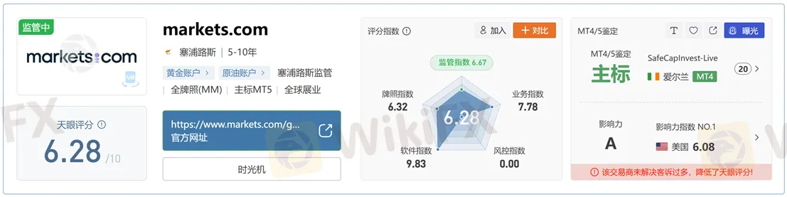当前Markets.com品牌以Safecap Investments Ltd实体名义持有塞浦路斯CYSEC全牌照(MM),监管机构登记的信息与该平台网站对应。