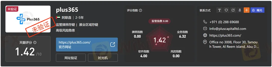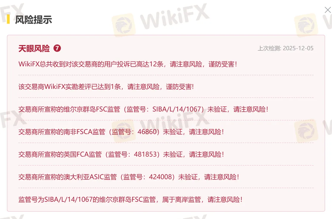 外汇天眼风险提示显示,该平台相关的监管信息有四个被标注为【未验证】,如下图所示。