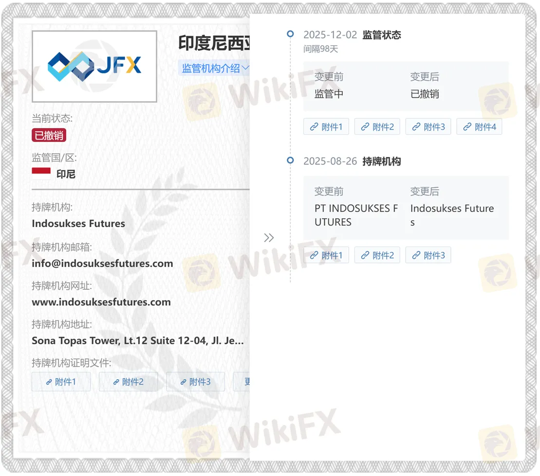 本次牌照信息变更源于印度尼西亚雅加达交易所(JFX)撤销了 Indosukses Futures 的零售外汇牌照授权。根据外汇天眼收录的监管信息显示,该实体于今年 8 月由 PT INDOSUKSES FUTURES 更名为 Indosukses Futures。