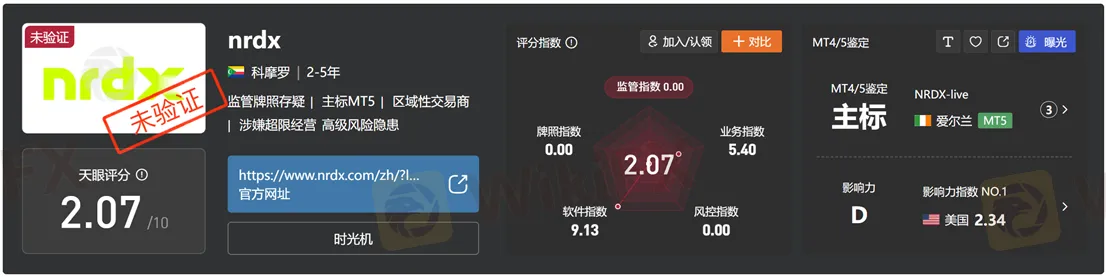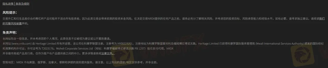 NRDX 官网目前已不再宣传 FSCA 授权或监管信息,而是声明由 Heritage Limited 所有并运营。该公司注册于 科摩罗联盟,注册号为 HY00223201,并在官网宣称已获得 科摩罗国际服务管理局(Mwali International Services Authority, MISA) 颁发的国际经纪与清算机构许可证(许可证号 T2023176)。
