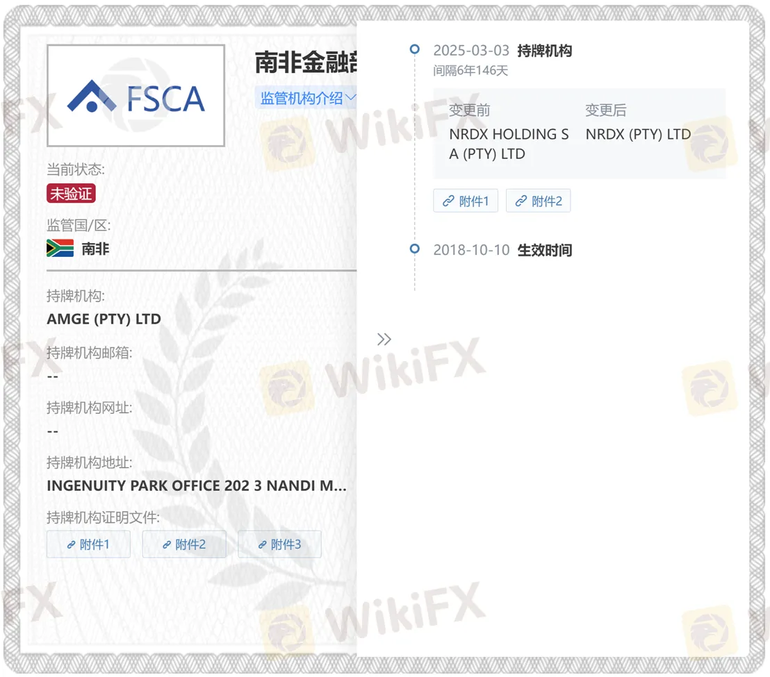 本次监管信息变更源于持牌实体由 NRDX (PTY) LTD 更名为 AMGE (PTY) LTD。根据外汇天眼收录的监管信息显示,该公司曾于今年 3 月由 NRDX HOLDING SA (PTY) LTD 更名为 NRDX (PTY) LTD。持有南非金融部门行为监管局(FSCA)金融服务企业牌照授权。