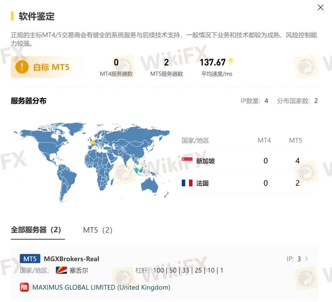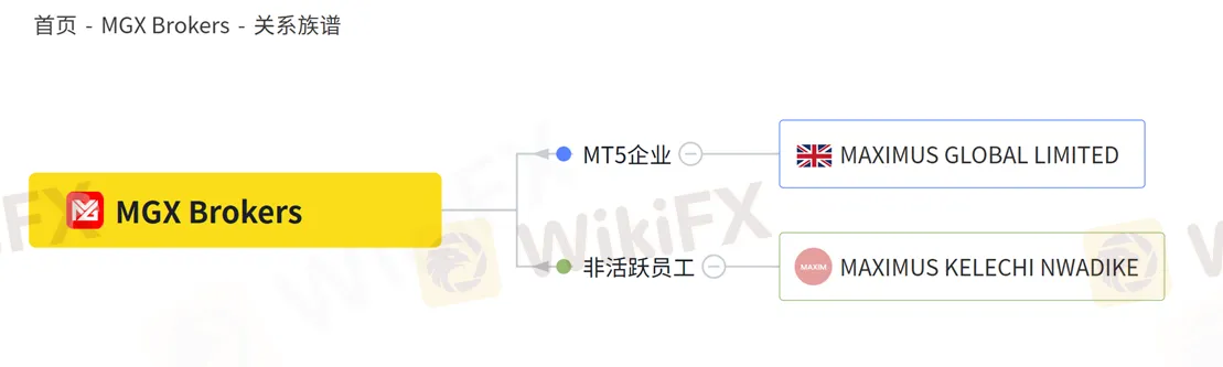 外汇天眼【关系族谱】显示MGX Brokers对应的MT5公司为 MAXIMUS GLOBAL LIMITED,是英国注册的公司。该平台使用的软件为白标MT5。