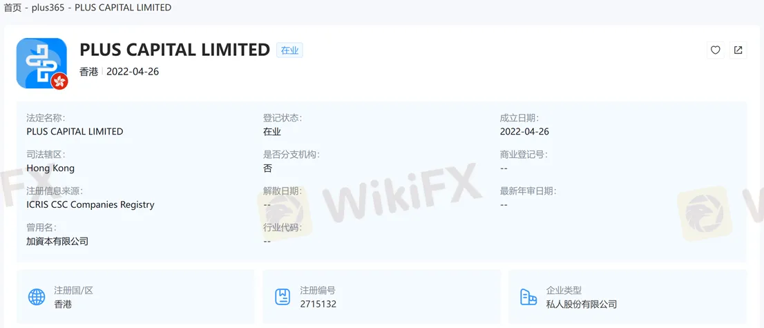 plus365对应的公司实体为PLUS CAPITAL LIMITED,注册于香港,注册编号2715132。曾用名:加資本有限公司。