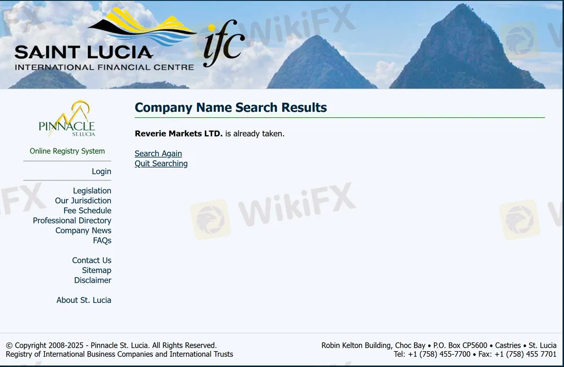 通过IFC(圣卢西亚国际金融中心)确实能够查询到Reverie Markets Ltd的登记,但IFC并不是一个金融监管机构,而是圣卢西亚政府设立的 国际商业公司注册与服务机构。它主要负责公司注册、信托登记和相关行政服务,没有外汇或金融交易的监管职能。
