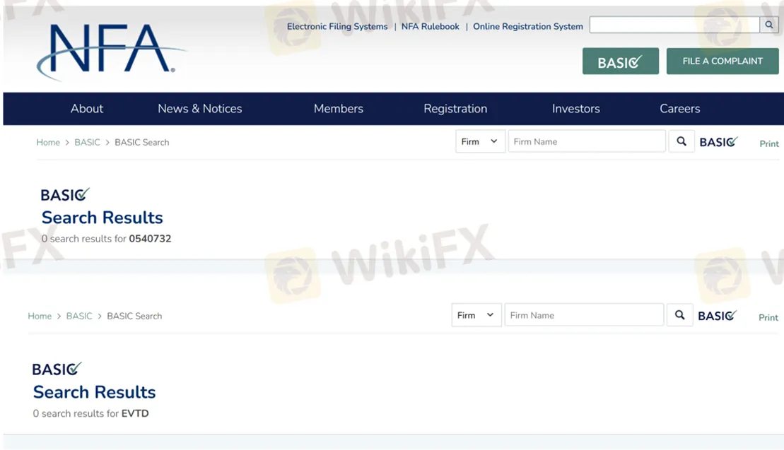 Evtd平台全网站没有任何公司信息,甚至公司全称都没有,宣传的美国国家期货协会(NFA)监管,不管是NFA编号查询还是名称查询,均无结果,意味着该平台虚构监管信息,没有任何监管。
