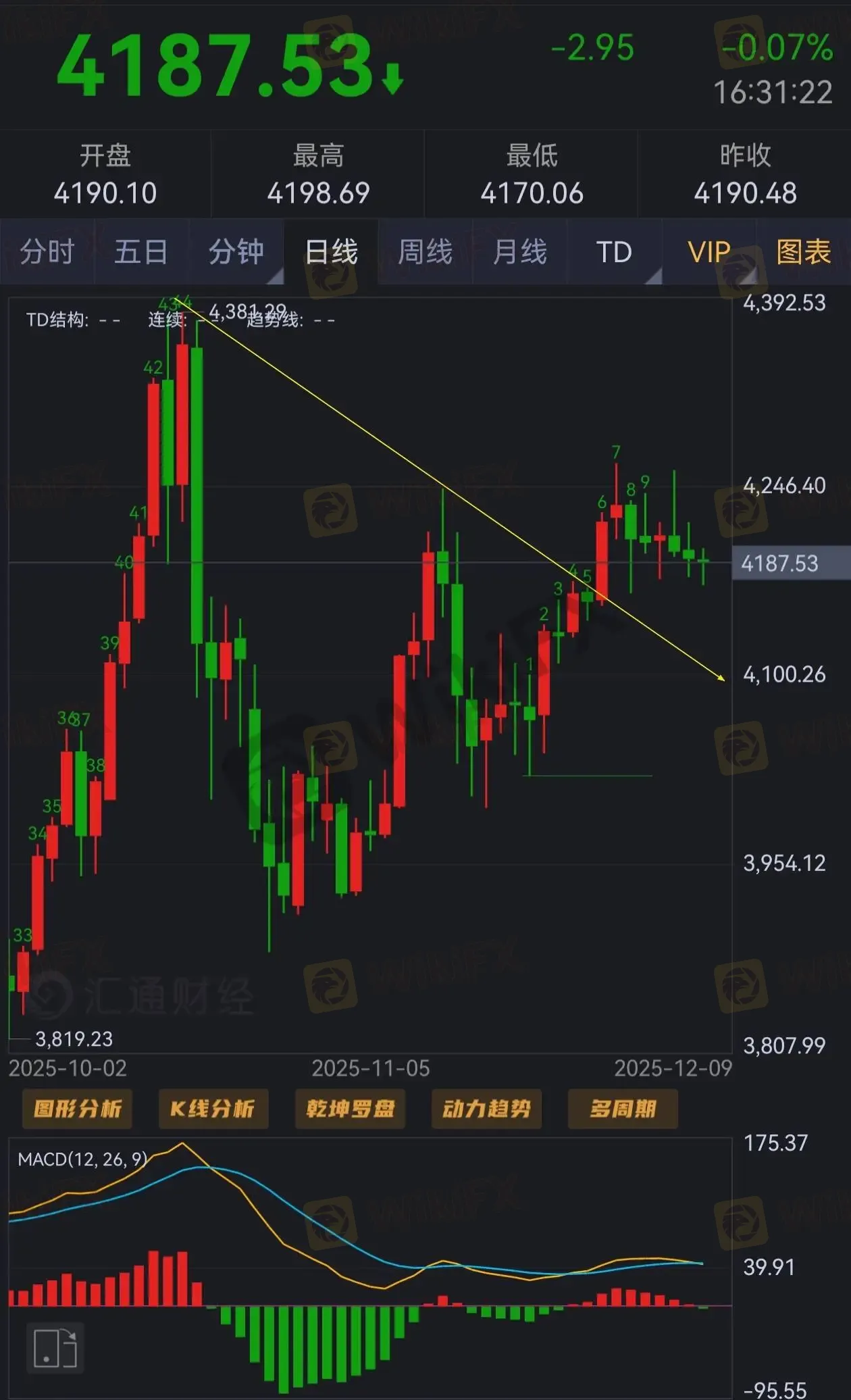 摘要:从形态上看,国际金价突破黄色趋势线后的上涨力度并不强,反而开始了宽幅盘整动作。本周四凌晨美联储将公布2025年的最后一次利率决议。按照惯例,利率决议前,金价都要涨一波,只是涨的空间大小的问题。所以下跌大概率只是诱空。虽然四小时4259和4264形成了双顶,下跌力度不够,所以能否延续下跌,值得怀疑。从日线上来看,今天是时间之窗,该时间看多,所以今天金价大概率走探底回升动作。从周线上看,不管是布林还是