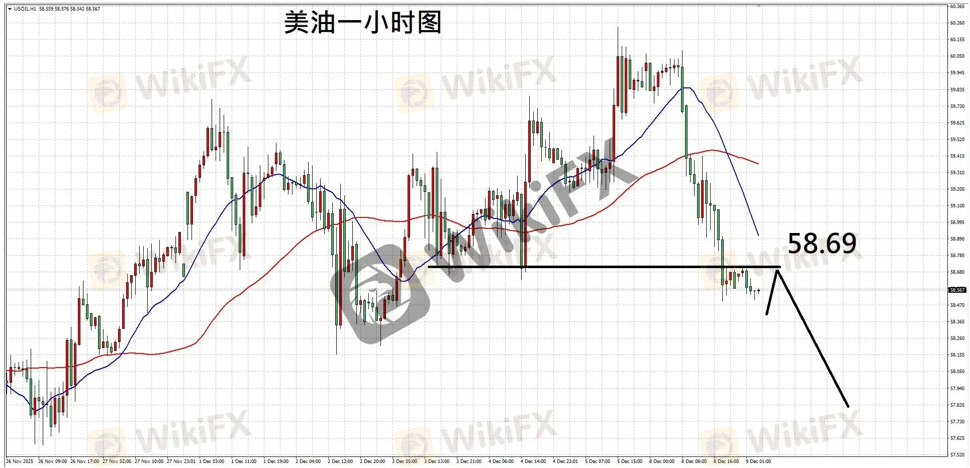 摘要:【基本面分析】尽管G7与欧盟讨论以全面海运禁令取代俄油价格上限,美国与委内瑞拉摩擦也持续升温,但整体地缘局势尚无关键突破,使油价的反弹动能受到限制。供应端方面,伊拉克恢复先前故障的原油设施运作,约占全球0.5%的产量重新回到市场,增加短线供给压力,冲击油价表现。总体而言,油价目前高度受消息面驱动,短期波动加剧,缺乏形成趋势性的持续力量。【技术分析】黄金一小时图,走势冲高后向下回落并刷新短线低点,显