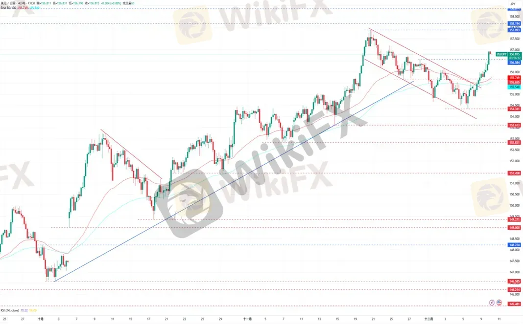 摘要:美元/日币(USDJPY): 新闻事件:周二,美元/日元连续第三个交易日走升,攀升至156.811日元。日本方面,日本央行行长植田和男近日多次释出货币政策转向讯号,暗示利率上调时间愈来愈近,市场也因此预期日本央行可能在12月19日的会议上升息。植田同时指出,近期长期利率上升速度偏快,若市场波动持续,日本央行随时准备介入债券市场。此外,日本政府亦密切关注日元汇率的剧烈波动,日本首相高市早苗表示,如有