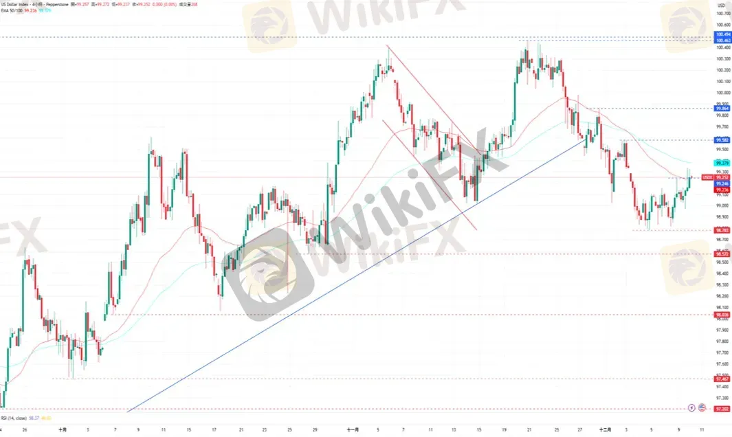 CPT Markets分析师指出,美元指数继续自98.783开始的反弹,目前价格涨势受EMA50均线的限制。上涨方面,若能突破EMA50均线,美元指数目前的阻力为12月2日的高点99.582水平,再来是11月28日的高点99.864。下跌方面,美元指数接下来的支撑为12月4日的低点98.783,接着是10月28日的低点98.572。