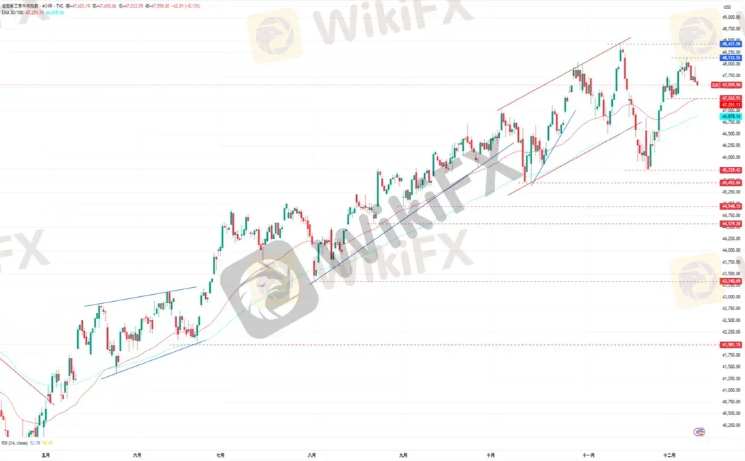道琼指数在18133点回落,只要价格保持在EMA50均线上方,就仍有再度上涨的可能。上涨方面,道琼指数目前的阻力为12月5日的高点48133点,再来是11月12日的历史高点48431点。下跌方面,道琼指数目前的支撑为12月2日的低点47263点,接着为11月21日低点45729点。